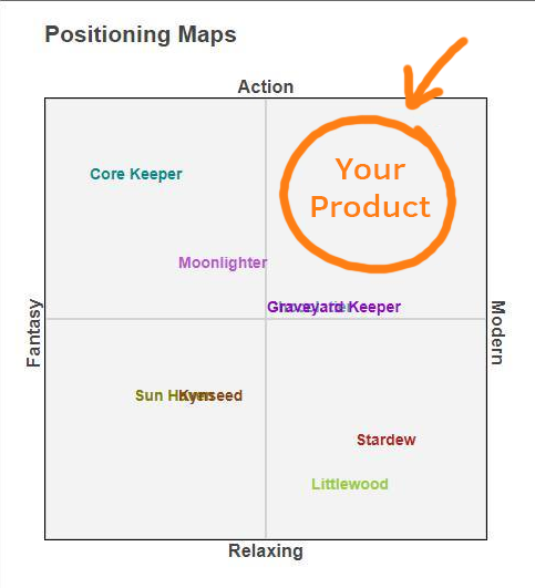 With the market mapping tool, simply lay out your axis labels (product qualities, styles, genres, world settings, values), and then insert your competitors.