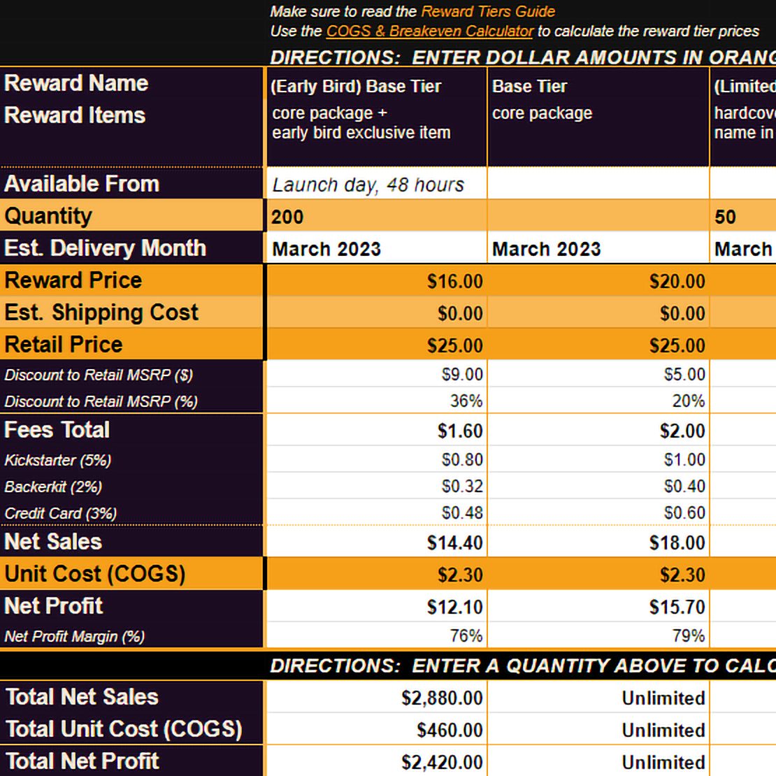 The Reward Tier Planner is used in conjunction with the COGS & Breakeven Calculator to plan out your reward tiers in detail, including their availability and revenue.